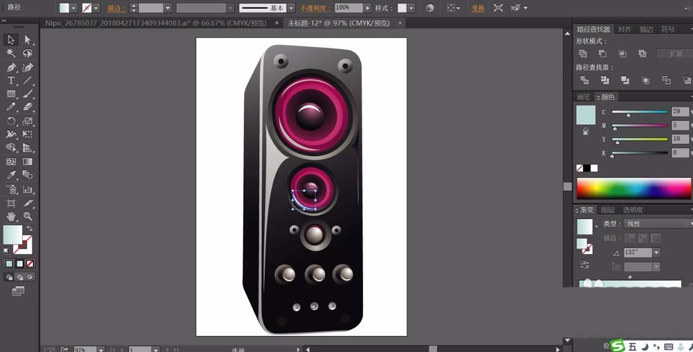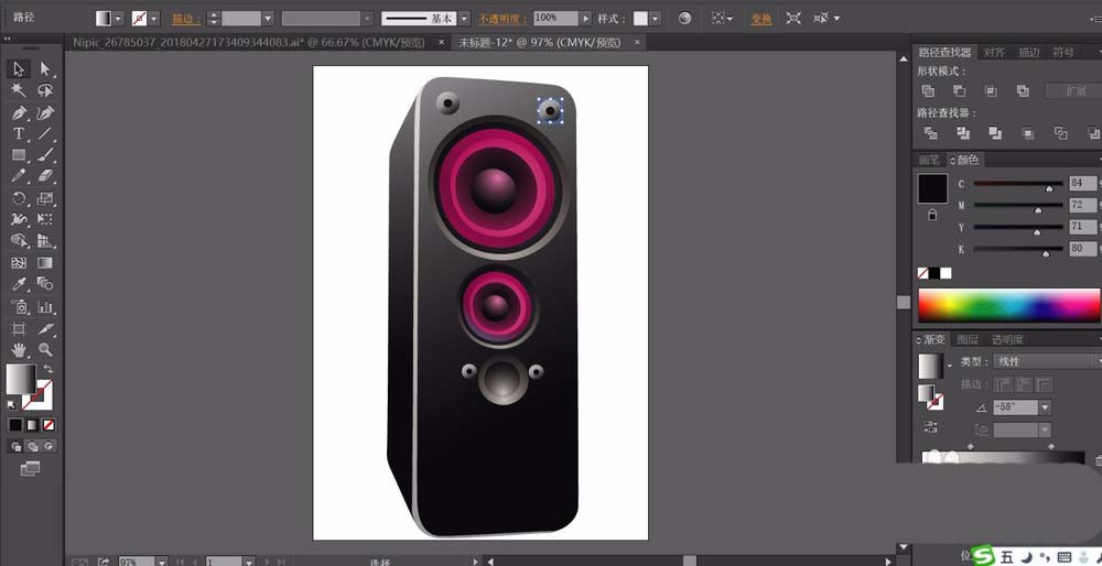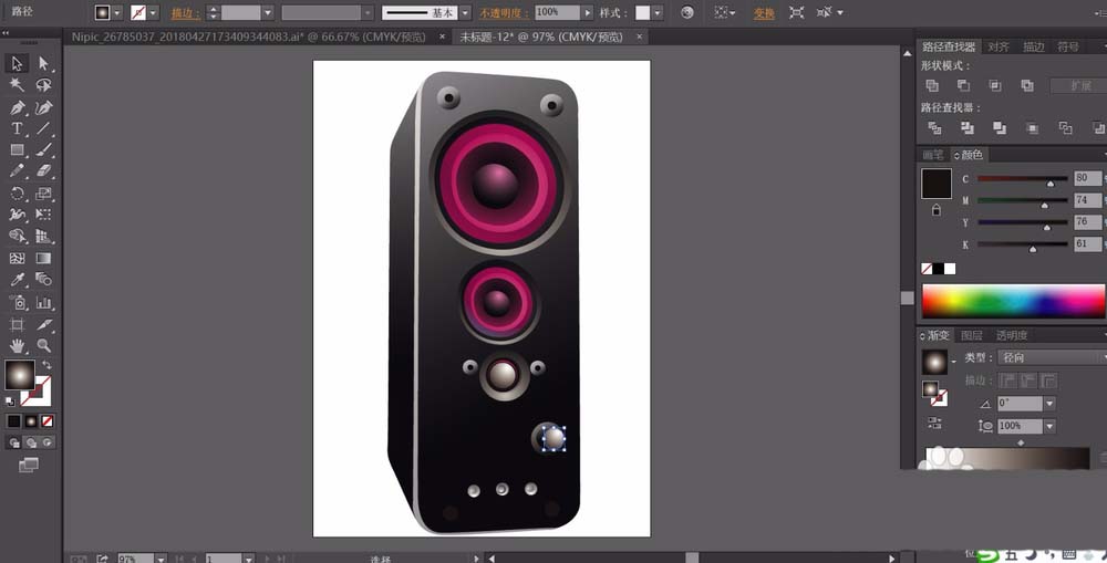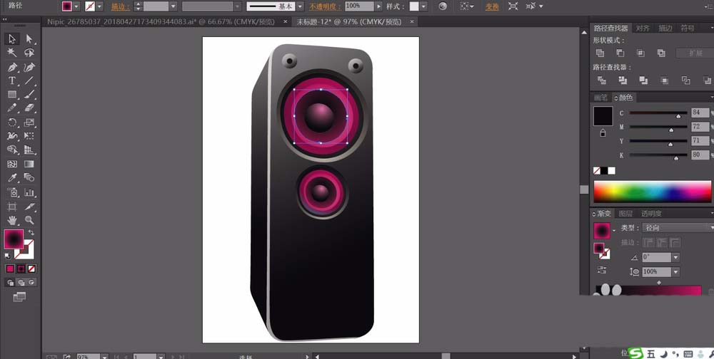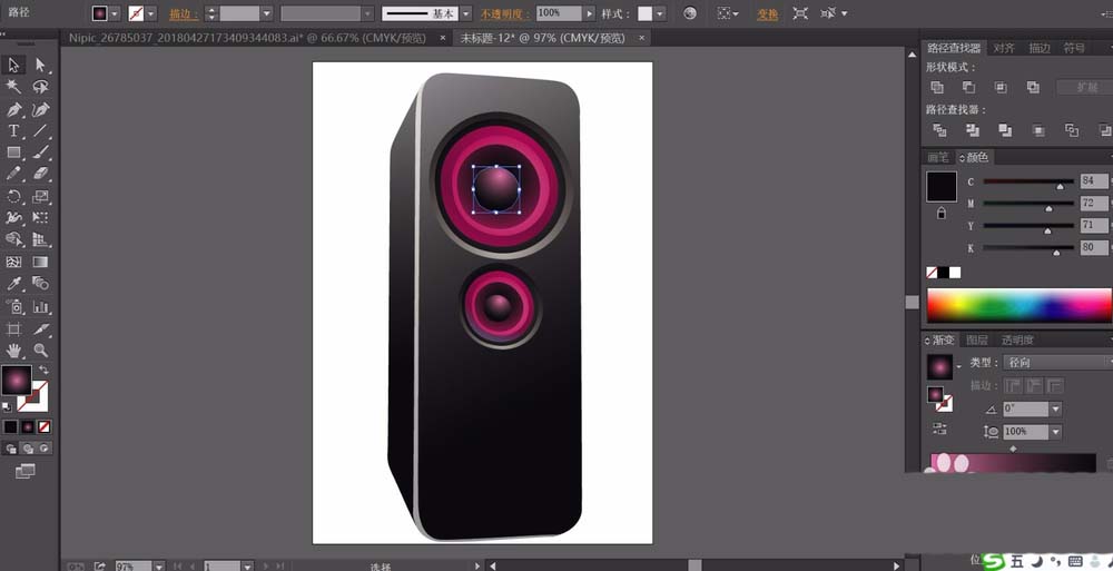 4、继续复制这个圆形的路径,我们在品红色的圆球上面填充红黑色的径向渐变,从而让三层结构的音响结构件呈现出来。