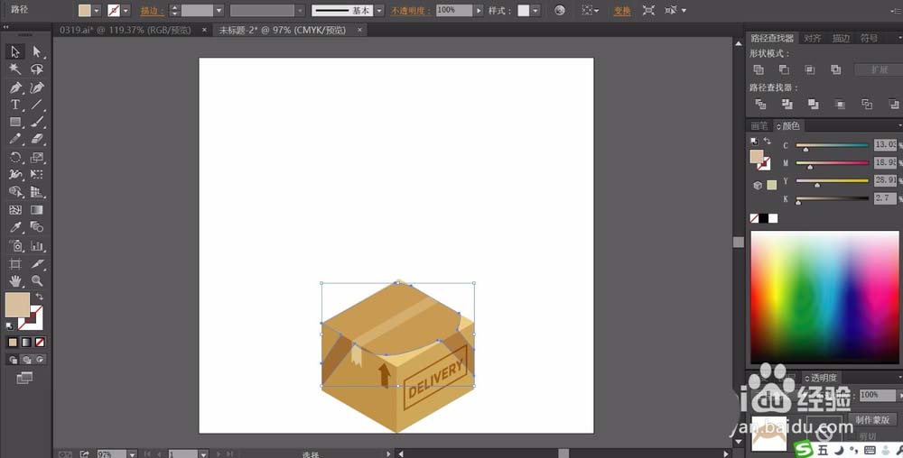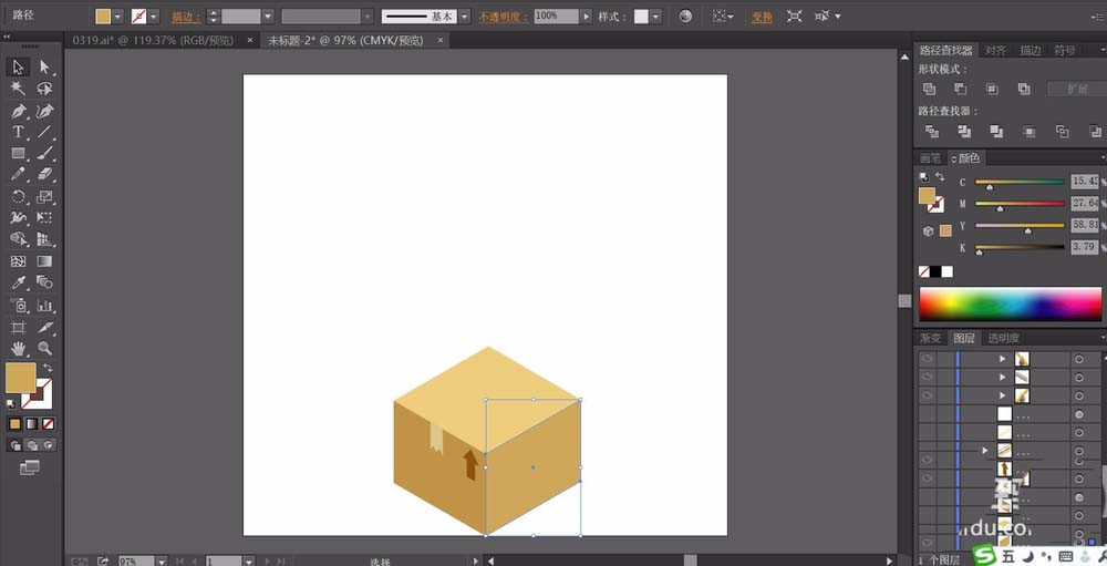 1、首先,我们要画出一个箱子的基本轮廓,只要画出三个面,顶端、左右侧面的路径,我们用不同明度的土黄色去填充,让高光出现在顶端。左侧面上的图案用淡色与棕色去填充。