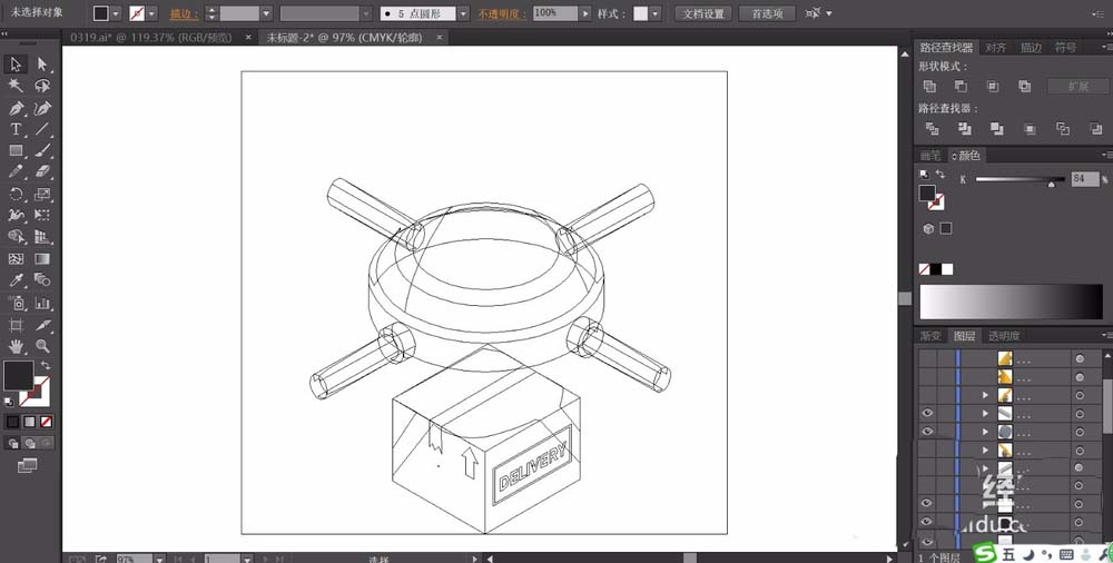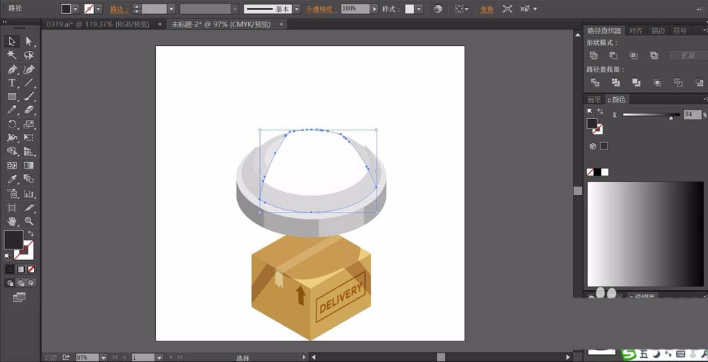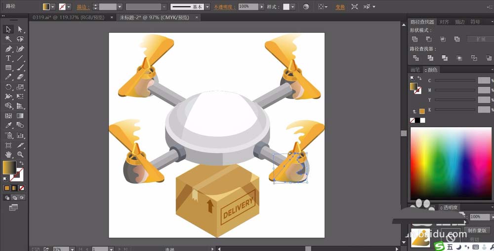 2、接着,我们画出箱子上面的无人机的阴影路径,我们用正片叠底的效果来呈现这个阴影的透明感觉。
