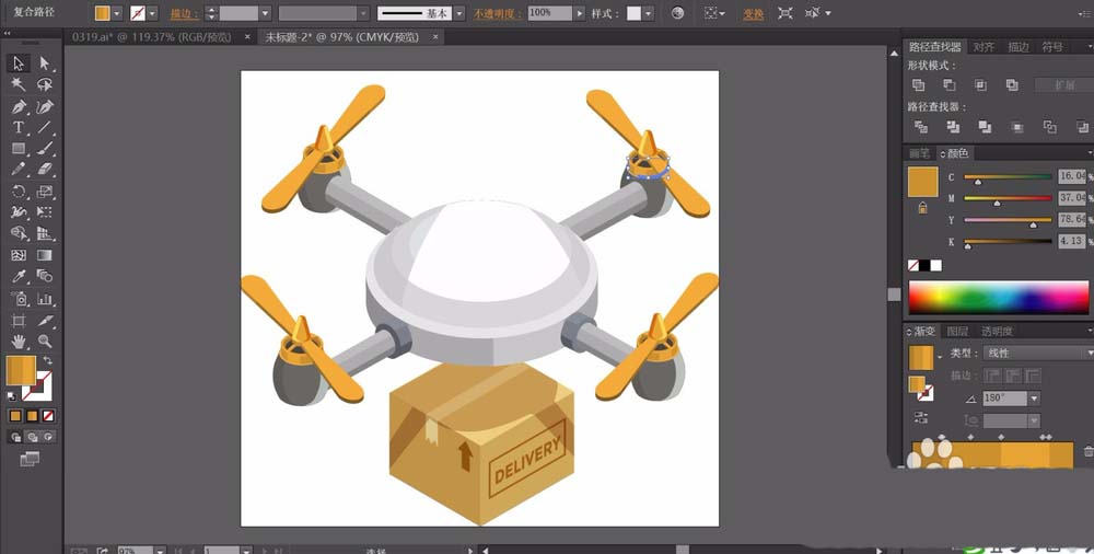 ai设计矢量图很方便,今天我们就来画一画货运无人机,这种用运送货物的无人机有着简单的结构,我们要学习设计多个不同的结构件,还有关于灰色的应用方法,土黄色的使用方法,变亮效果的使用技巧等等,下面我们就来看看详细的教程,请看下文详细介绍。