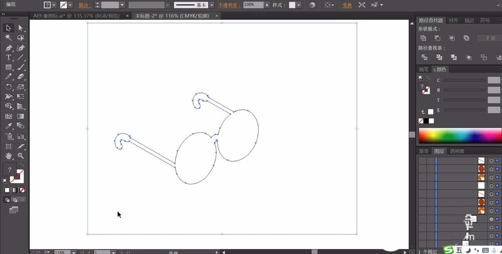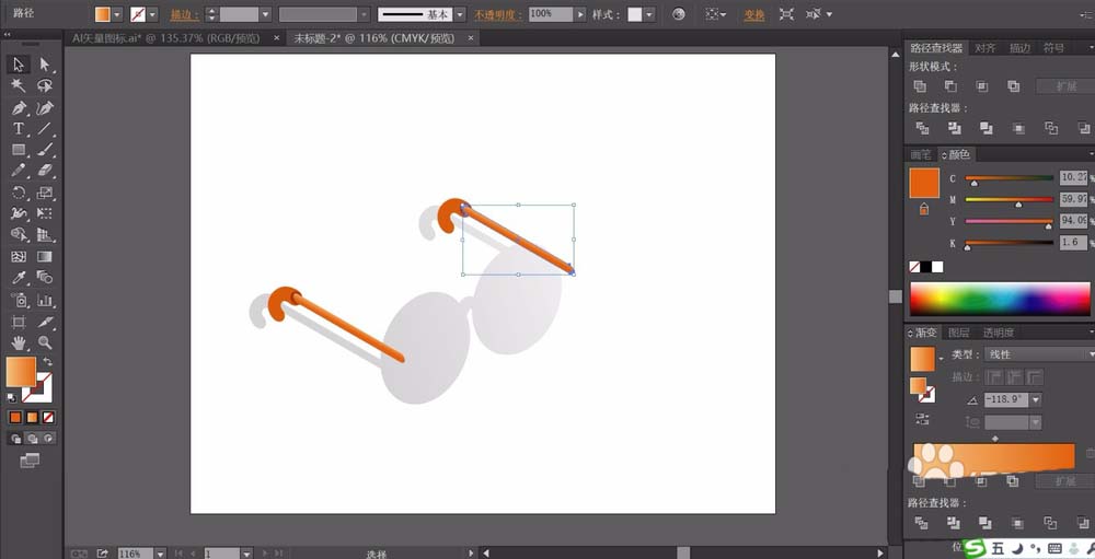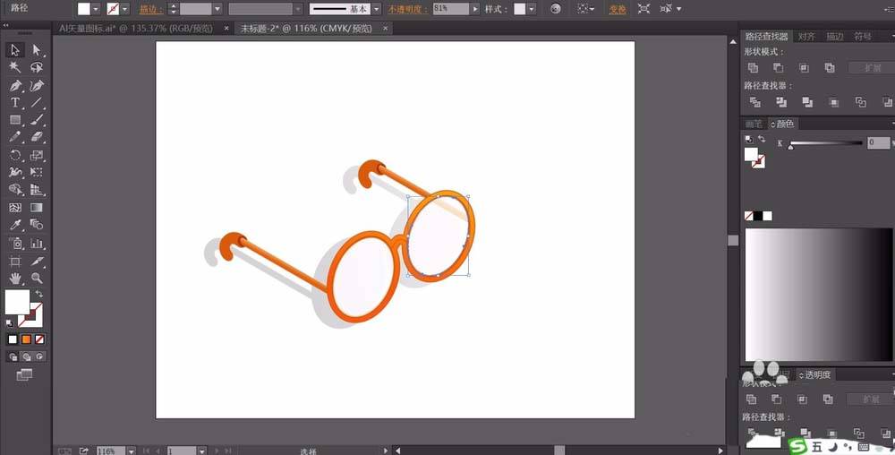 2、继续画出全部的眼镜支架,我们用橙色来继续填充,用灰色来填充镜片的路径并设置成半透明的样子。