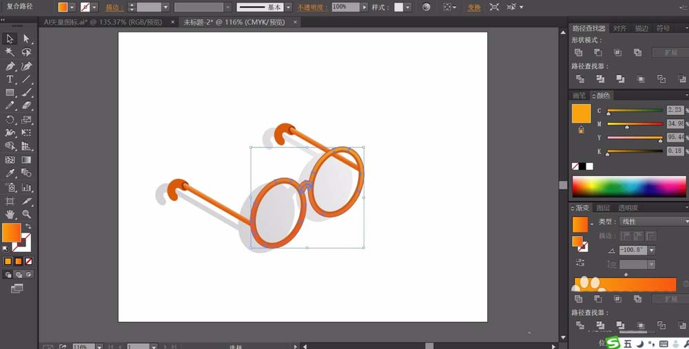 3、我们画出眼镜的镜片的边框的路径,我们用橙黄色的渐变来填充。