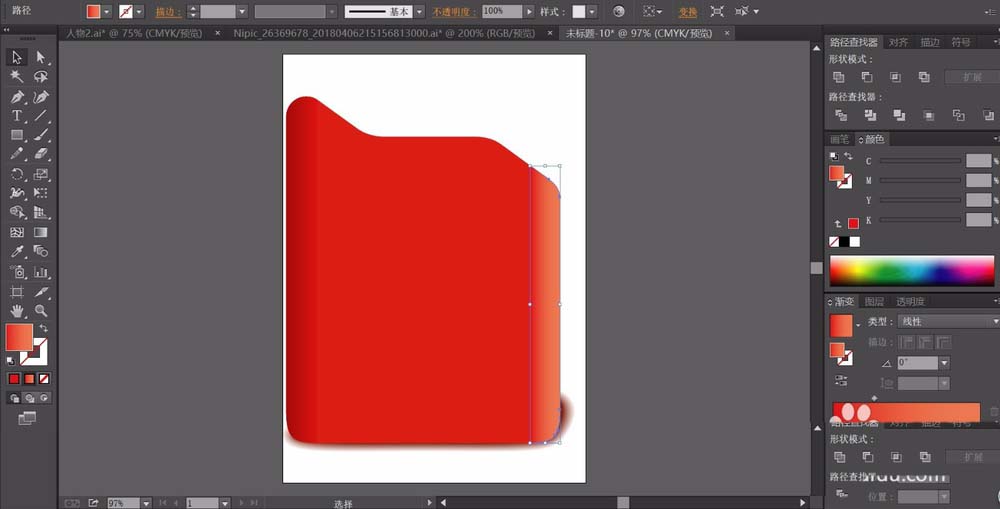 4、我们设置多个不同明度的红色来填充这样的一个顶端的路径,让自然的曲折变化出现在顶端,再填充边缘路径不同的红色的渐变,让高光与暗区的变化出现在顶端的边缘。
