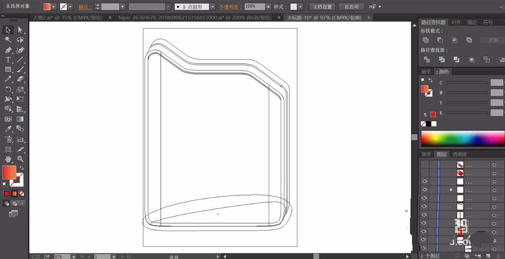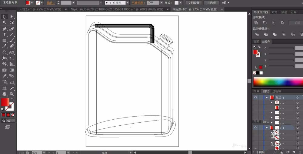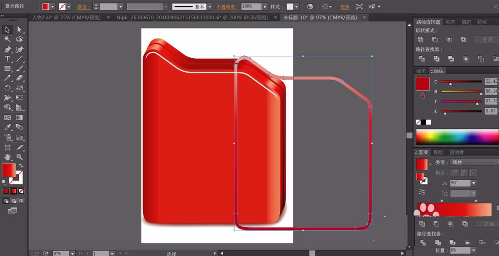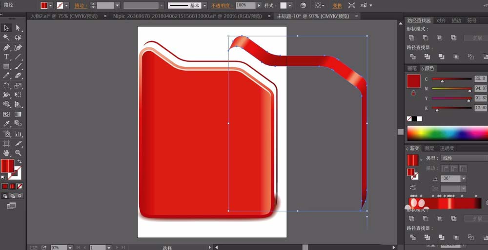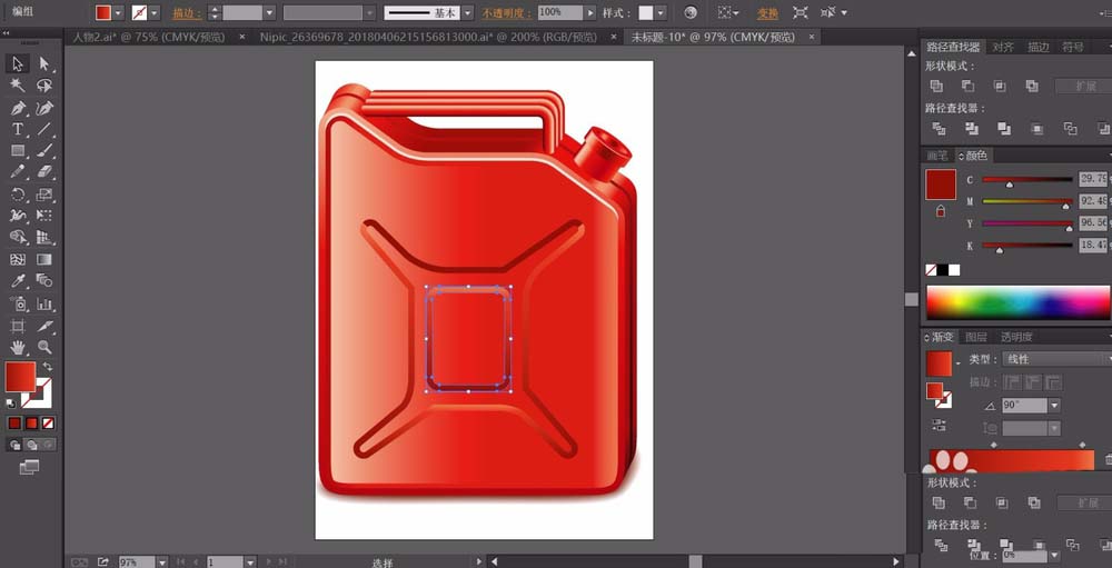 7、最后,我们复制多个手柄,让其组合成为一个自然的手柄状态。再在油桶的正面画出凹凸的结构路径,分别用不同的红色的渐变填充,从而让油桶的正面图案呈现出来,完成油桶矢量图设计。