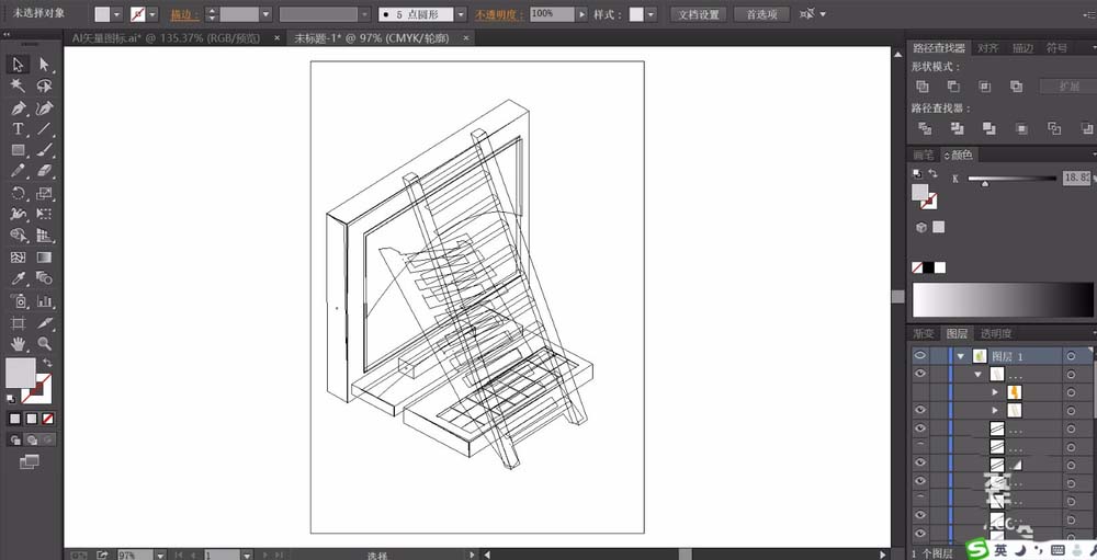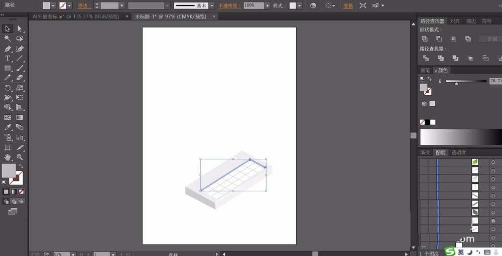 5、这一步,我们画出阶梯的阴影路径,还有阶梯的细节路径,重点是每一格的梯子的顶端与右侧的平面路径。通过两个面来呈现梯子的立体结构。