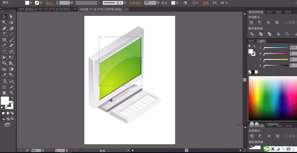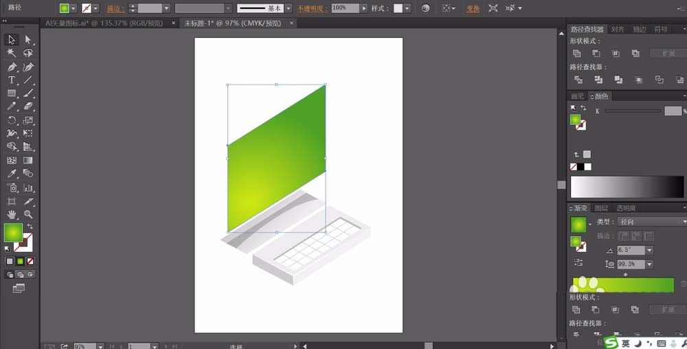 3、接着,我们用钢笔画出显示器的基本轮廓,我们用灰色来填充边缘,用绿色的渐变填充屏幕。