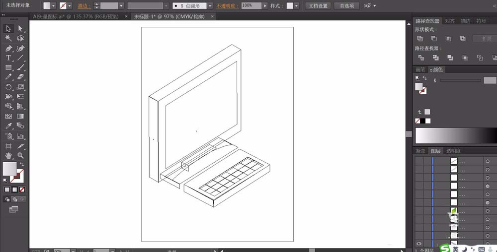 4、画出显示器的立体结构,我们要画出显示器的顶端、左侧而、还有边框的细节元素的路径,我们用灰色的渐变填充各个边框的路径,让明度的变化呈现出来,再画出屏幕的暗区,我们用20%的白色来填充。