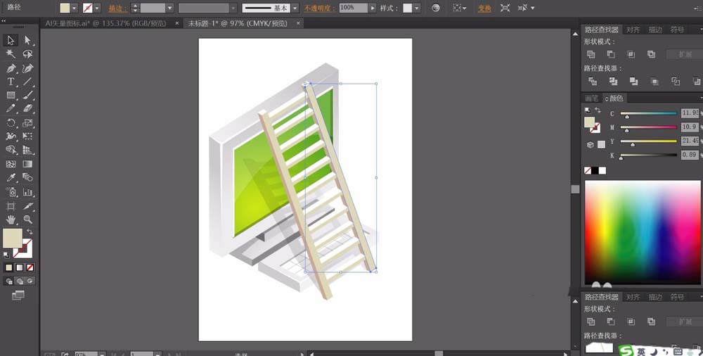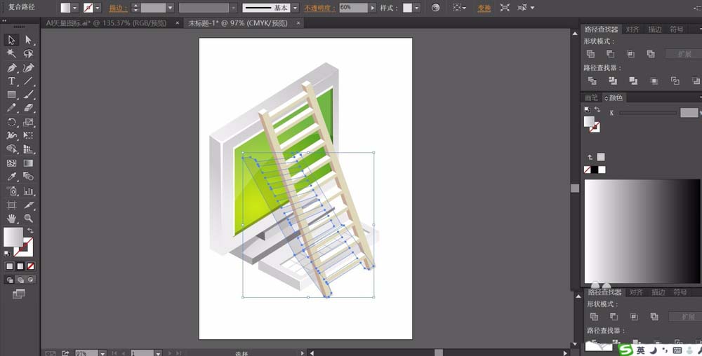 6、我们用正片叠底的半透明的灰色的渐变来填充阴影路径,用灰白色与灰色搭配填充梯子的每一个小格子,两边的支撑柱用米黄色来填充。