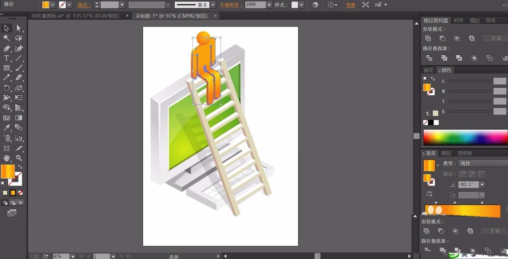 7、最后,我们画出阶梯上面的一个小人的形状轮廓,我们用橙色的渐变来填充这些路径,在身体的路径上多做出一个色彩的变化,完成阶梯图片设计。