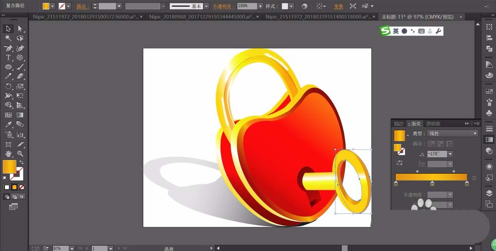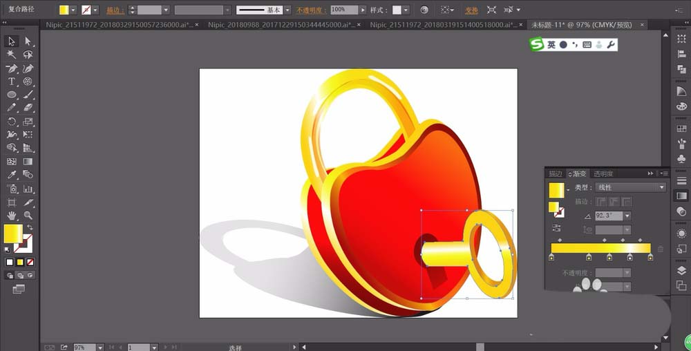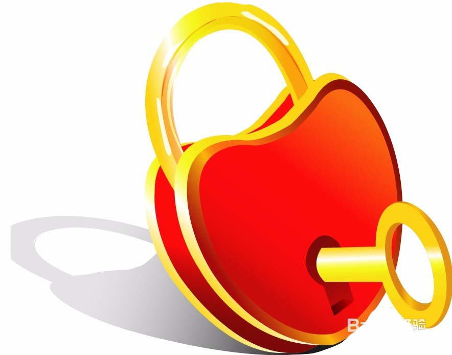 7、最后,我们画出小锁头的右侧面的钥匙的基本路径,再画出钥匙的阴影路径,我们分别用金黄色的渐变填充,阴影用灰黑色的渐变填充。阴影用暗红色的渐变填充。