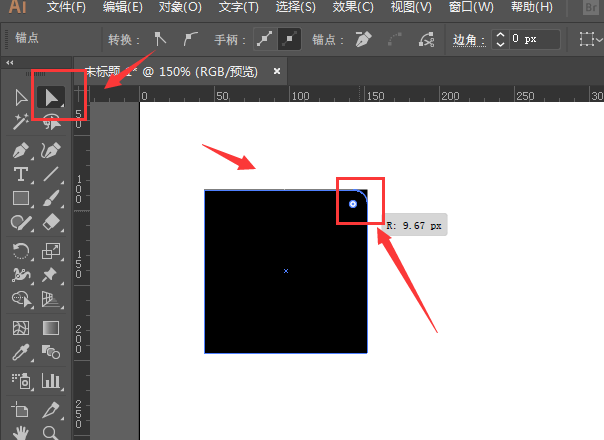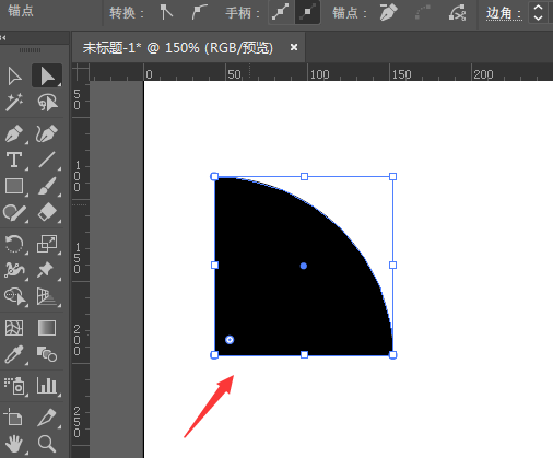 2、然后使用白色箭头选中右上角的锚点,这时候就会只针对这一个锚点调节角度大小