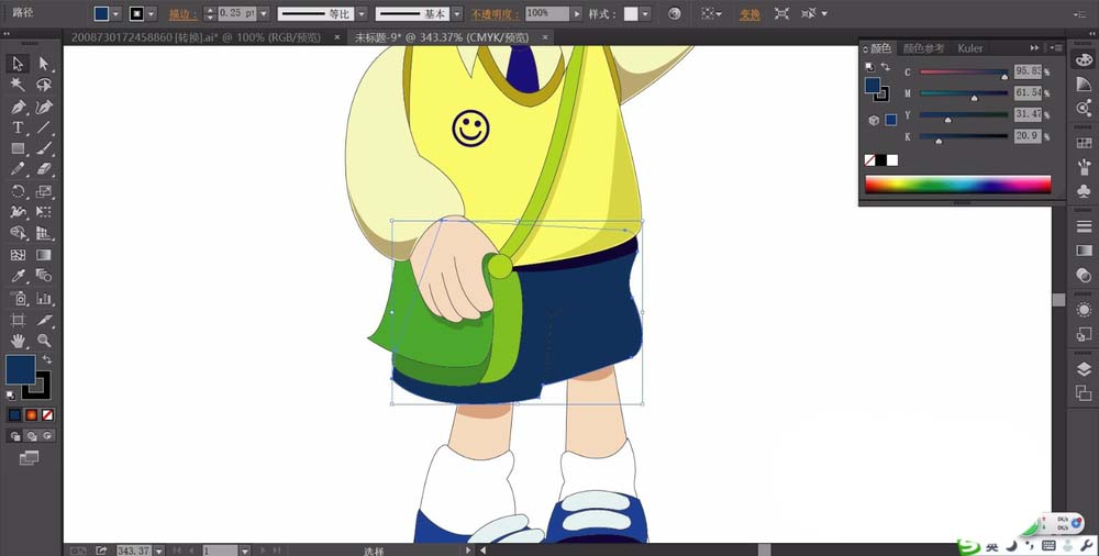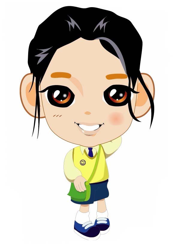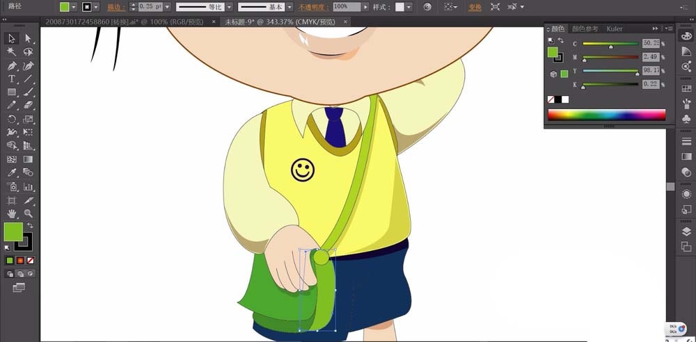 6、我们用黄色与淡黄色为毛衣与衬衫进行填色,用绿色与浅绿色搭配填充皮包,用蓝黑色填充短裤与领带。