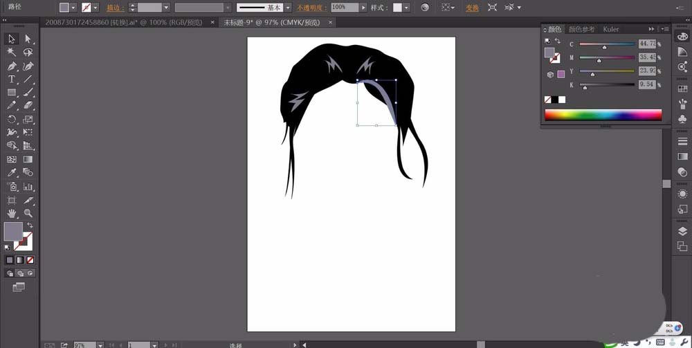 1、先用钢笔画出女生的头发的路径,再用灰黑色与灰色搭配填充头发的主体与高光区域路径。
