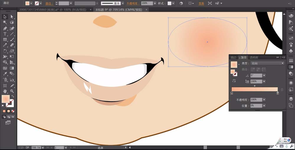 2、我们用粉色填充女孩的脸蛋,在脸上用粉色的渐变填充红晕,用粉灰色填充嘴唇,用灰黑色填充嘴巴的内部左侧与右侧,用暗粉色填充嘴唇的下方。用暗粉色填充鼻子。