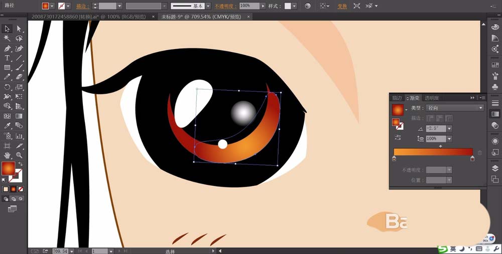 3、这一步开始为女生的眼晴填色,我们用灰黑色填充眼晴,用灰黑色的渐变填充瞳孔,用橙红色的渐变填充眼晴的下方边缘,用白色填充高光,用暗粉色填充眉毛。