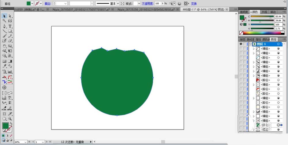 1、使用圆形工具与钢笔工具画出一个打开的椰子的形状轮廓路径并用绿色填充。