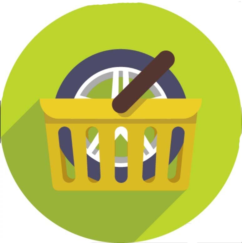 6、我们用紫黑色填充轮胎的外部结构,再用淡黄绿色填充购物篮的顶端路径。用咖啡色填充购物篮的手柄路径,完成汽车用品图标设计。