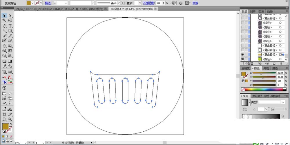 1、先用圆形画出图标的背景路径,再用圆角矩形画出购物篮的基本孔隙与整个购物篮子的正面路径。