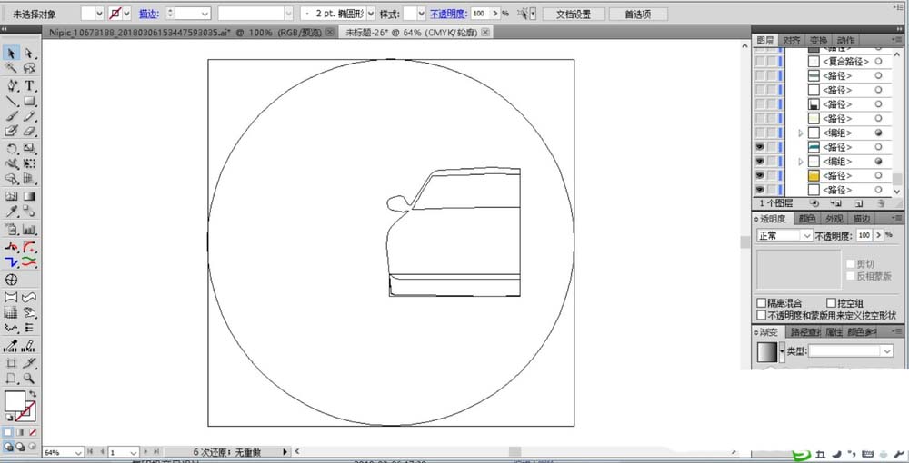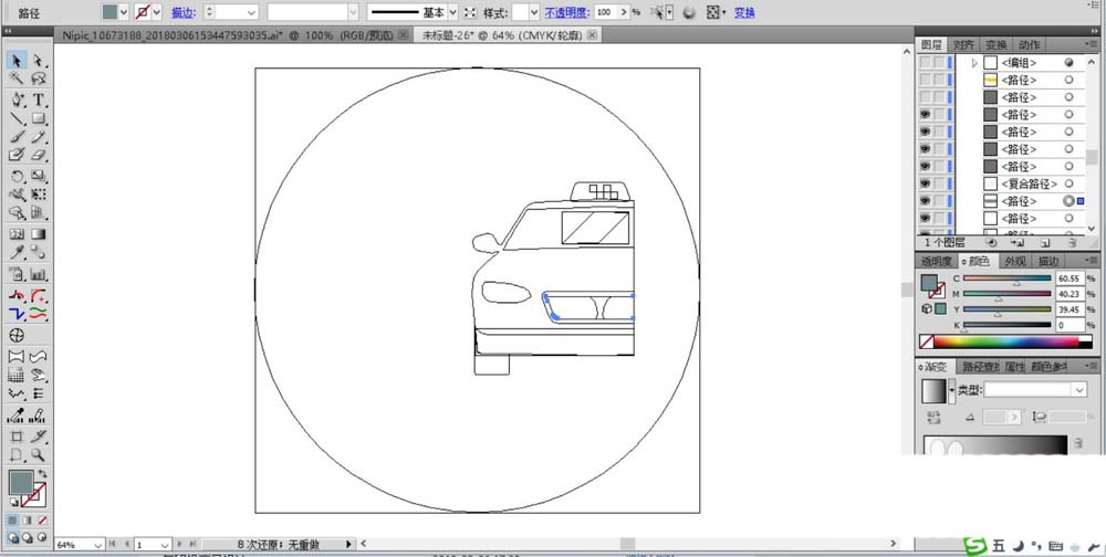 3、继续画出车辆的车灯与车轮等细节元素的路径在车体上面。