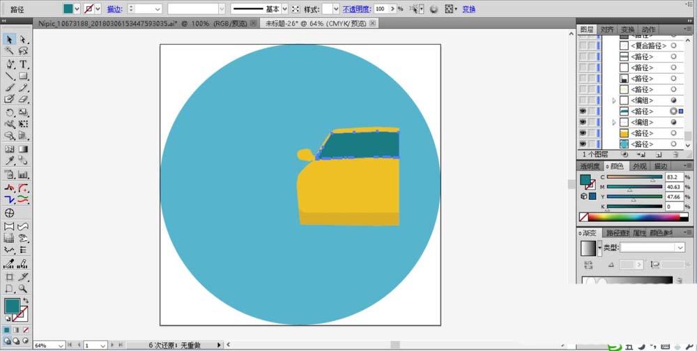 2、我们用蓝色、橙黄色、青色分别填充圆形背景、车体、车窗玻璃等元素。