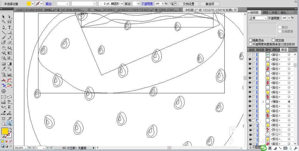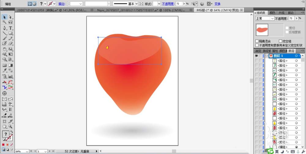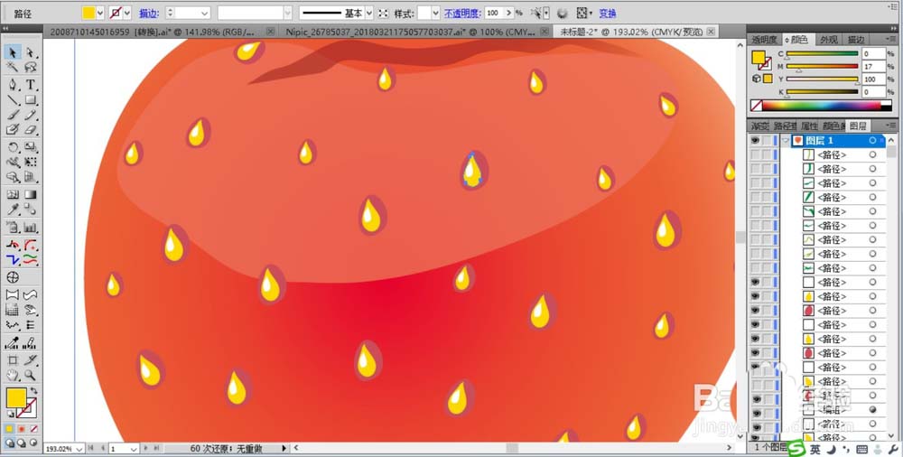 4、继续用淡粉色来填充草莓的亮区路径,设置高光区域的色彩的透明度为70%左右,用黄色、暗红色搭配填充草莓表面的果籽元素路径。