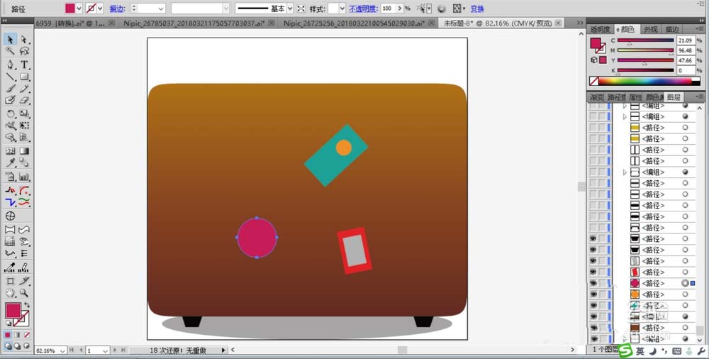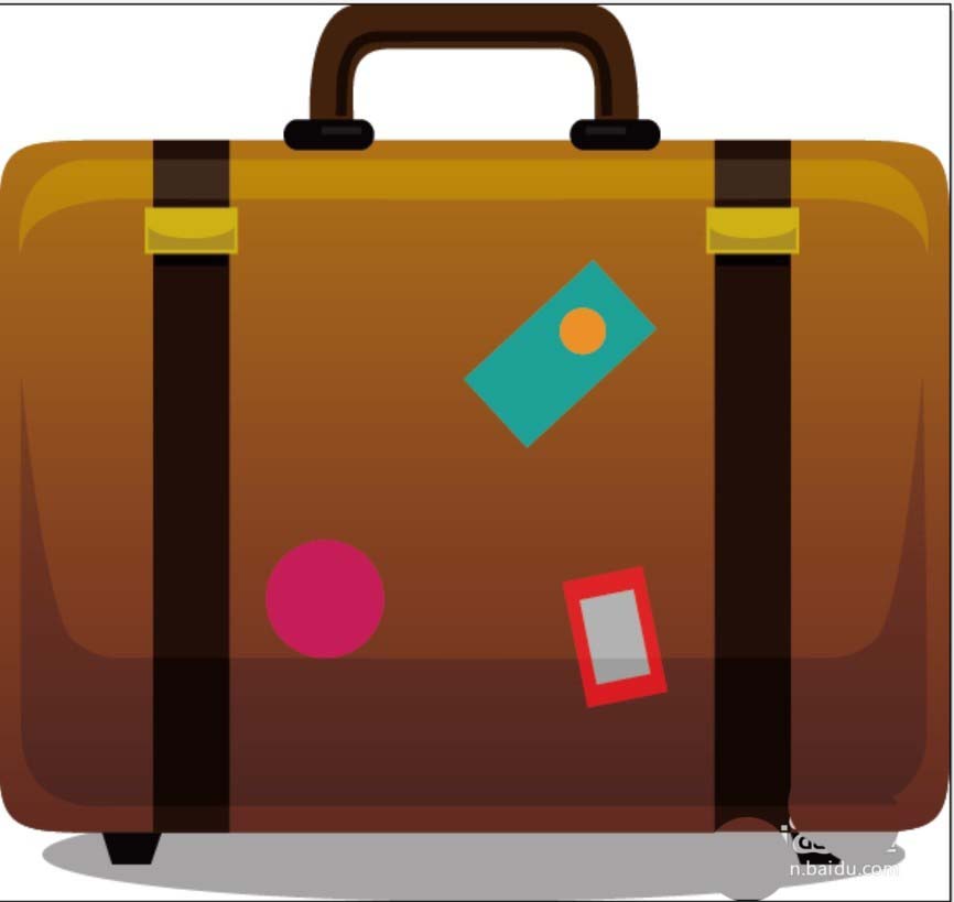 2、继续使用矩形工具与圆形工具画出男包表面的三块贴纸,我们用青色、粉红色、红色分别填充不同形状的贴纸,让丰富的色彩效果呈现出来。