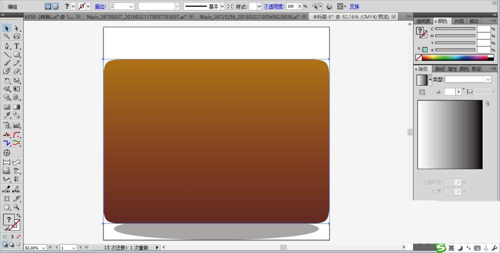 1、选择圆角矩形画出男包的基本轮廓,使用圆形工具画出男包的阴影,我们用茶色的渐变填充男包的轮廓,用半透明的灰色填充阴影。