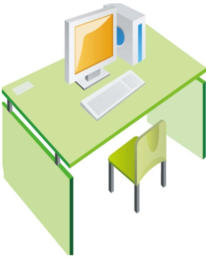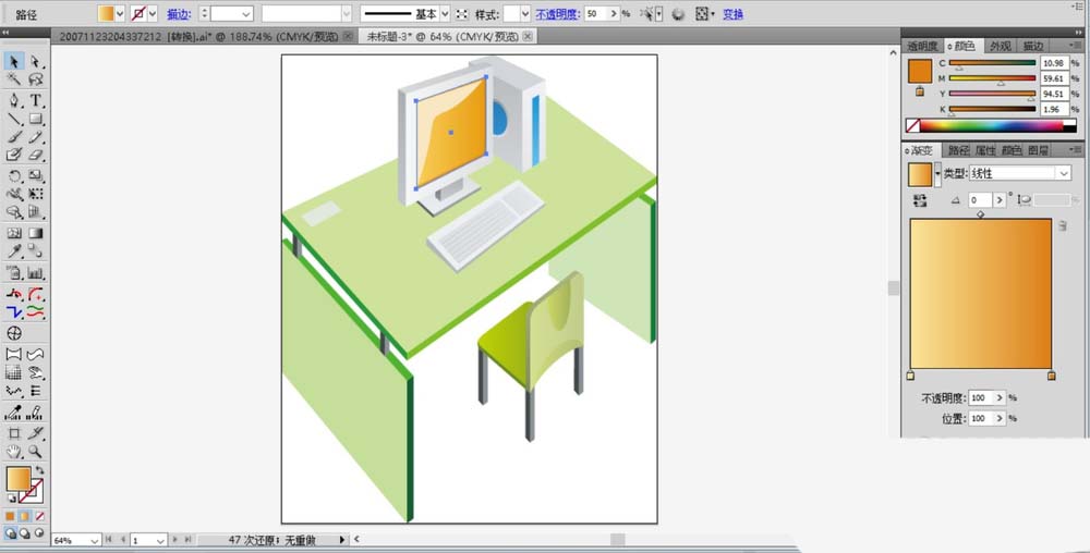 8、我们用橙黄色的渐变填充显示屏的正面,用半透明的白色填充显示屏的高光路径,用灰白色的渐变填充键盘的细节路径,完成办公桌简笔画。