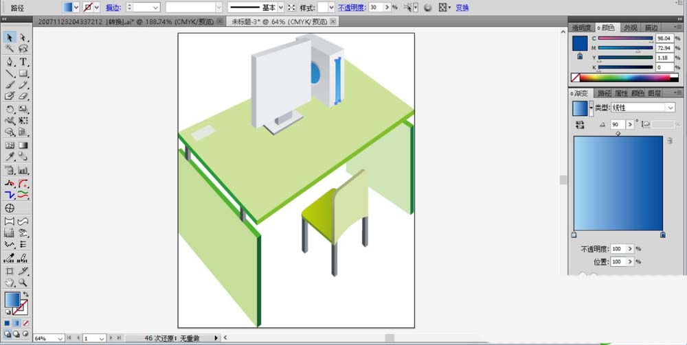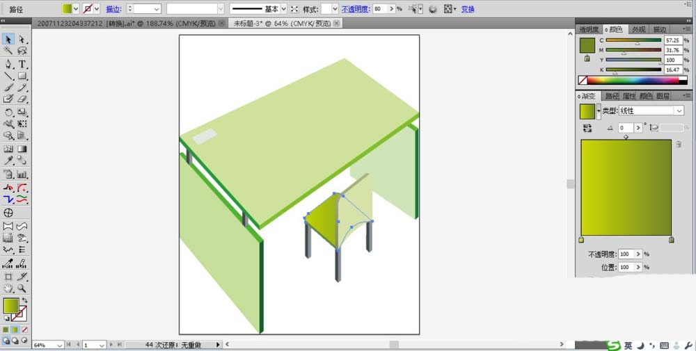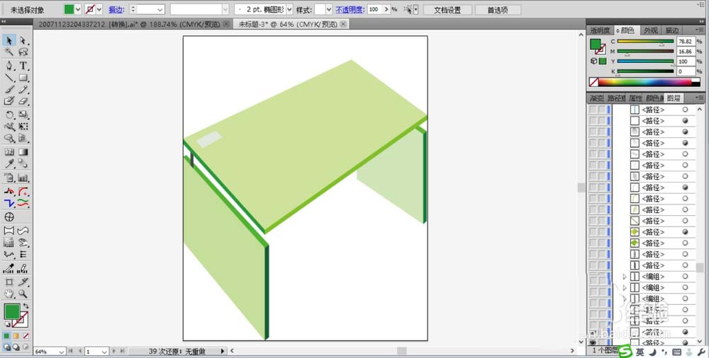 2、我们用不同明度的绿色分别填充桌面、桌板、侧面等路径。让不同侧面的高光与暗区呈现出来。