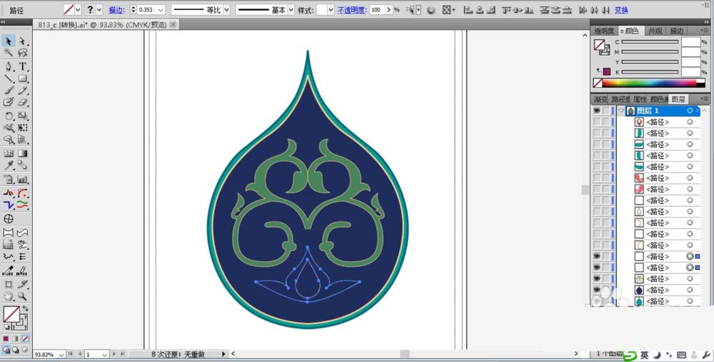 2、复制一下这个水滴并缩小到95%,我们填充为蓝黑色,选择钢笔工具绘制出水滴内的花边,我们填充一个灰绿色。