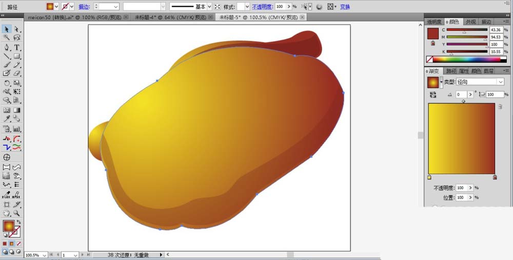 5、继续用橙黄色的渐变填充鸡腿的路径,用暗橙色的渐变填充鸡腿的阴影路径。