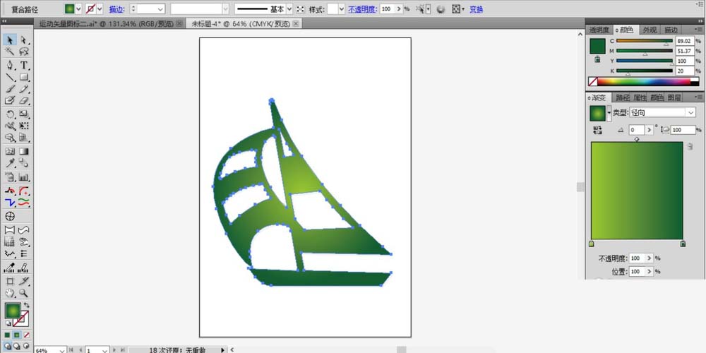 3、设置一个绿色的渐变填充这个帆船的路径,渐变为径向,完成帆船图标的设计。