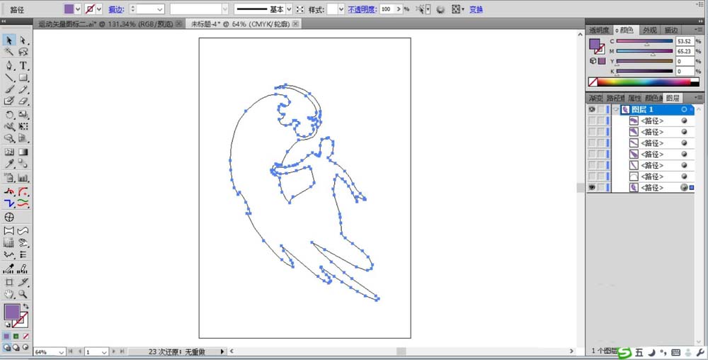 4、继续用钢笔画出第二个冲浪运动员的图标,我们先画出波浪与运动员合在一起的轮廓。