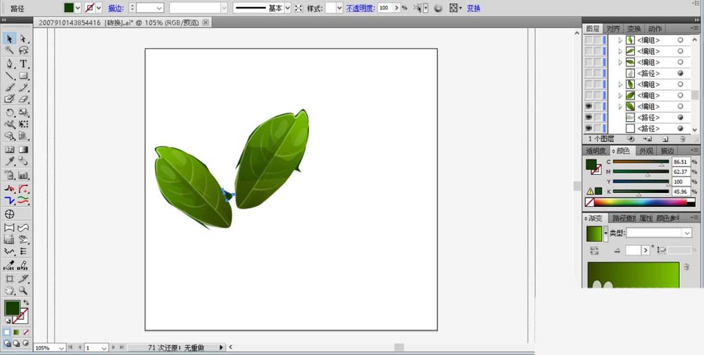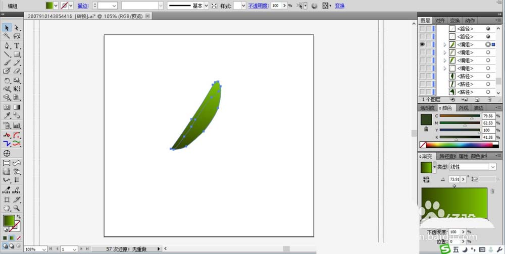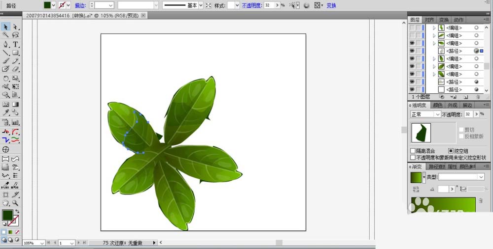 1、先用钢笔画出半片的叶子,我们用绿色的渐变填充叶片的路径。