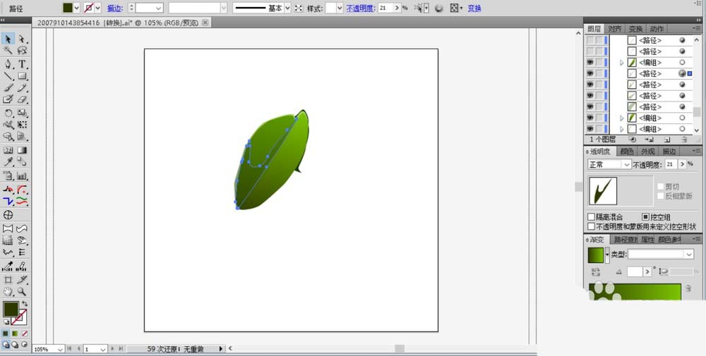 2、继续绘制出左侧的半片叶子,我们用半透明的深绿色填充叶子的暗光区域。