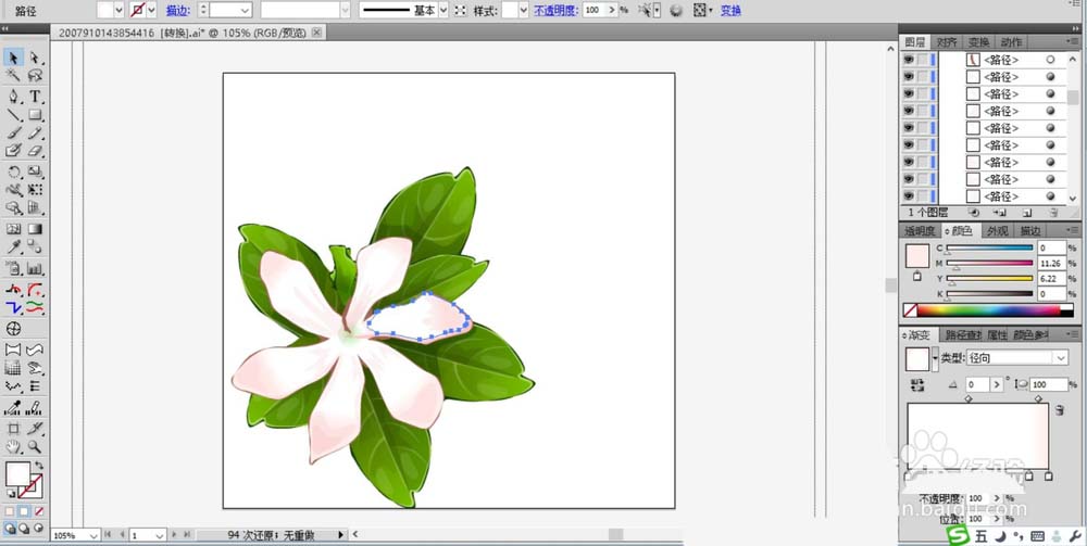 5、继续用钢笔画出一个六片花瓣的栀子花形状,我们用白色到粉色的渐变填充花朵的花瓣,让粉色出现在花瓣的边缘。