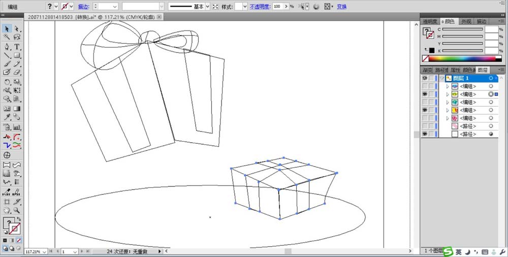 1、先用钢笔工具画出一只简单的小礼盒的形状,再把盒子外面的封带一一画出来。
