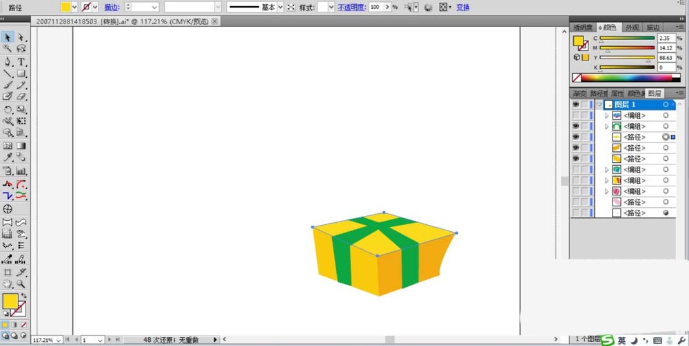 4、用黄色与绿色搭配填充第一个绘制出来的小礼盒,让盒子的表面填充不同明度的黄色,让封带用绿色填充。