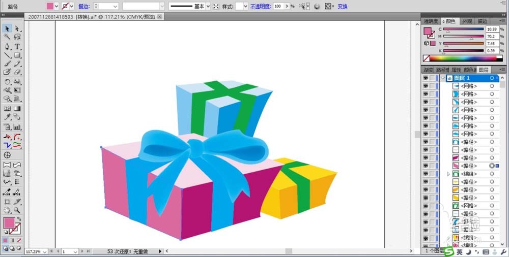 6、接着,我们用粉红色与蓝色搭配填充第三只大礼盒,封带用蓝色的网格渐变填充,盒子用不同的粉红色填充。