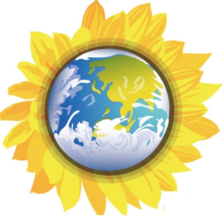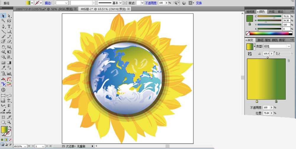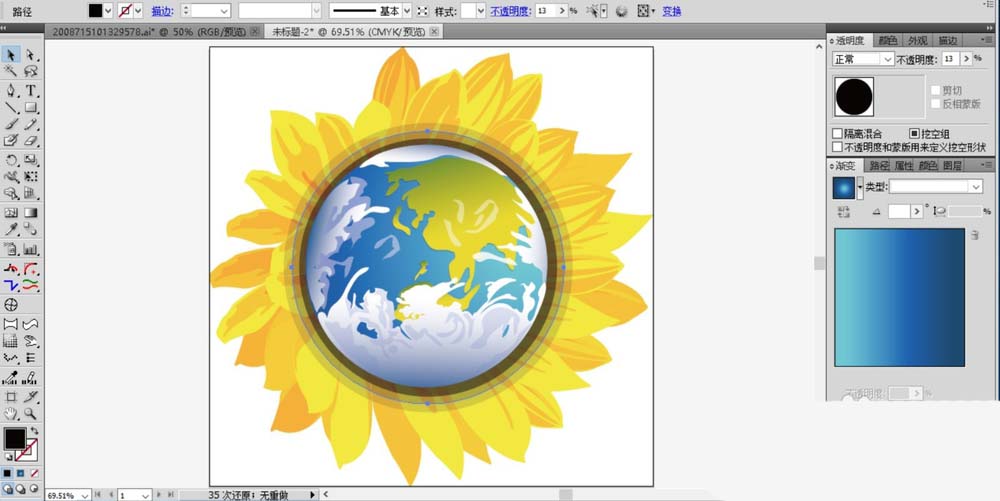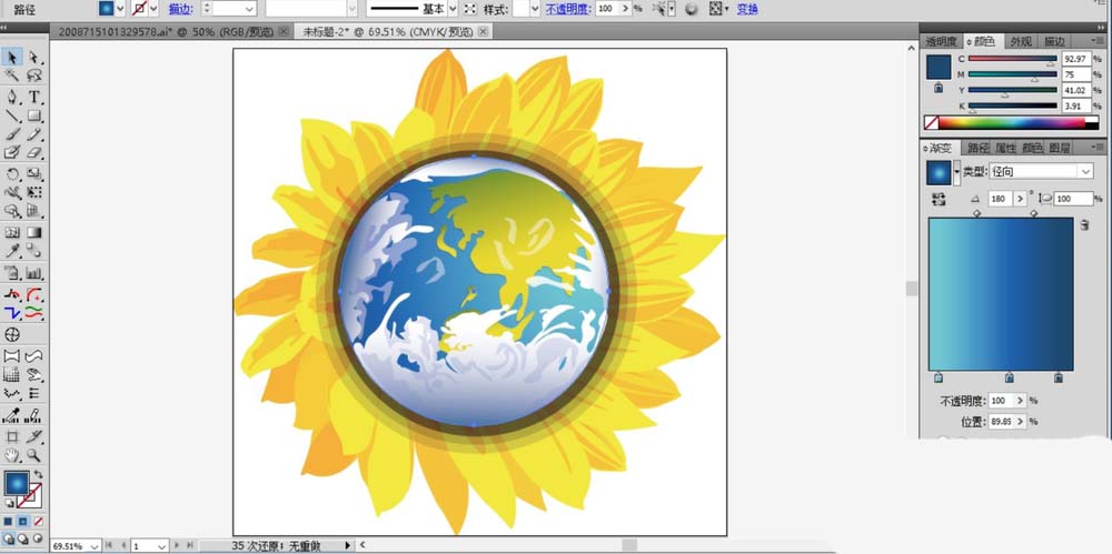 7、我们用蓝色的渐变填充地球上的海洋,我们用灰白色填充天空,用黄色的渐变填充陆地,周围用半透明的灰黑色来呈现地球的阴影,完成抽象向日葵设计。