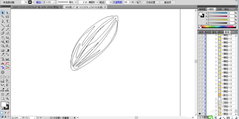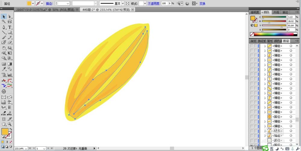 1、先用钢笔画出向日葵的一片花瓣,细致的画出向日葵的花瓣上面的暗光与高光的区域路径,从而呈现花瓣的色彩细节变化。
