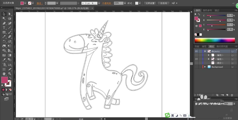 1、先用钢笔画出独角兽的整个身体轮廓,包括:头部、耳朵、鬃毛、四肢等主要的结构元素,再用暗红色填充所有的独角兽的边缘路径。