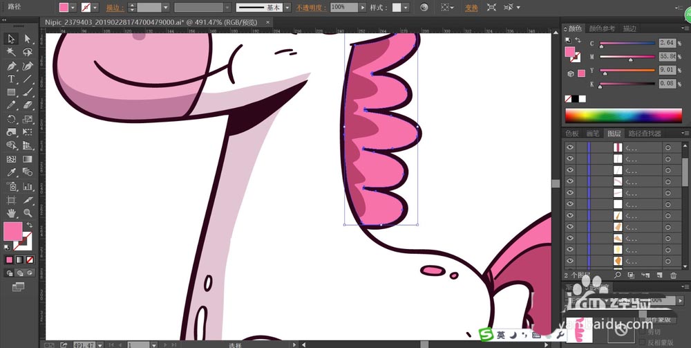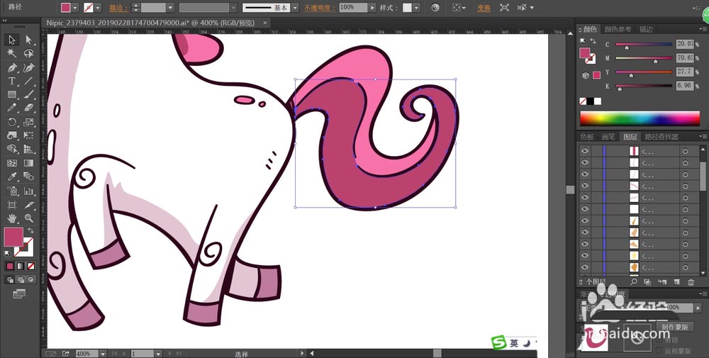 4、这一步,我们用粉红色与暗粉红色搭配填充独角兽的大尾巴,再用淡粉色填充独角兽的蹄子。