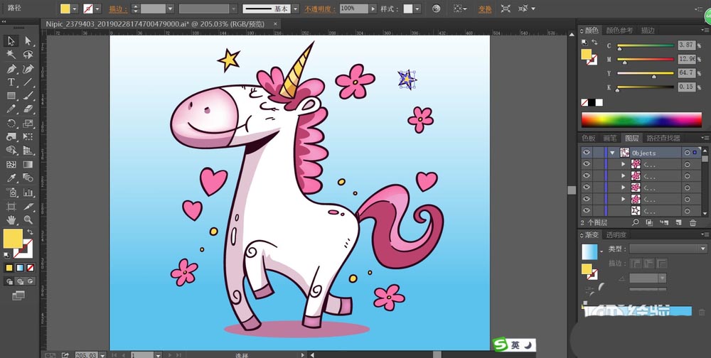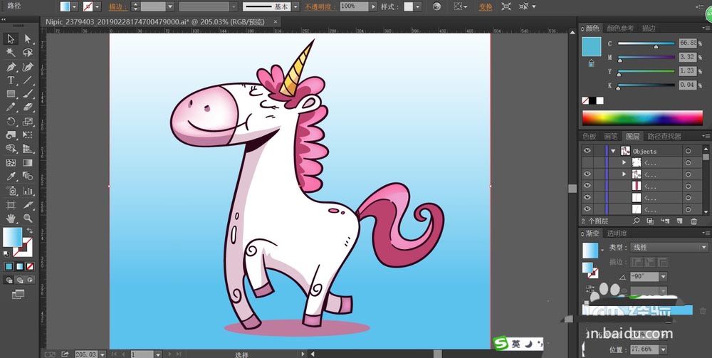 5、选择网格工具给独角兽的四肢、嘴巴、鬃毛、尾巴分别做出粉红色的渐变效果,让独角兽身体的立体材质呈现出来。用蓝色的渐变填充独角兽的背景。