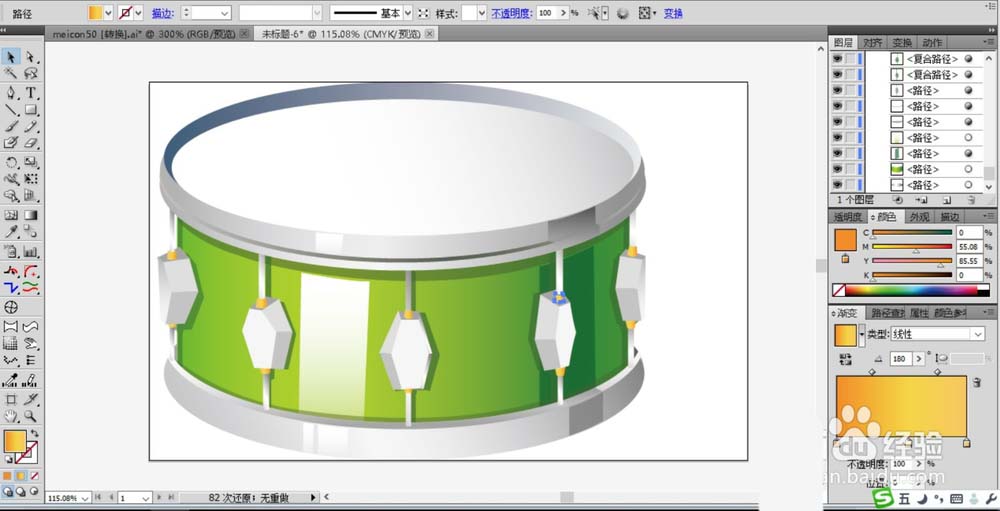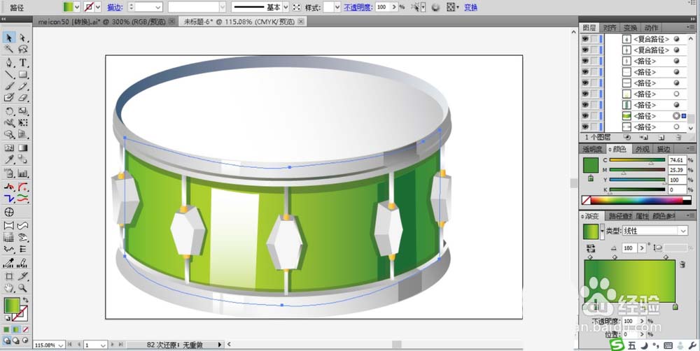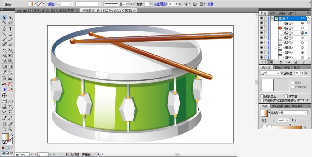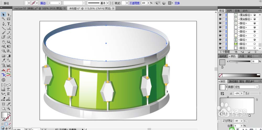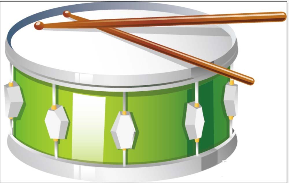 6、用半透明的绿色渐变完成小鼓表面的各种阴影区域的填充,让小鼓表面的色彩细节更加的丰富。