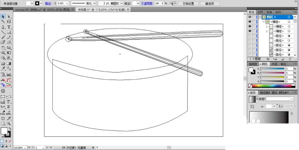 1、先用钢笔与圆形工具画出小鼓的圆形轮廓,还有两根小鼓棒的基本轮廓路径。