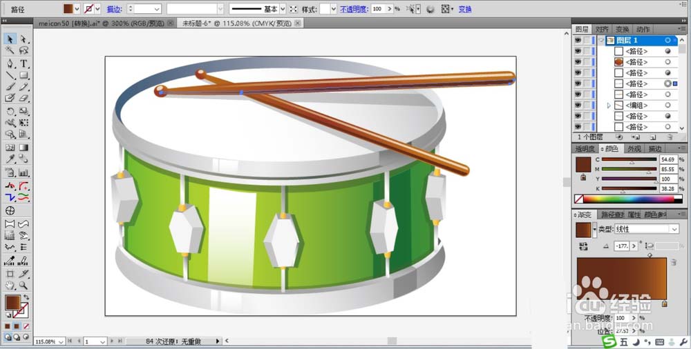 7、用棕色的渐变填充小鼓表面的小鼓棒,用白色到橙色的渐变填充小鼓棒表面的高光区域路径,完成小鼓图片设计。