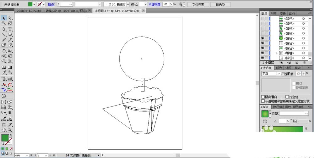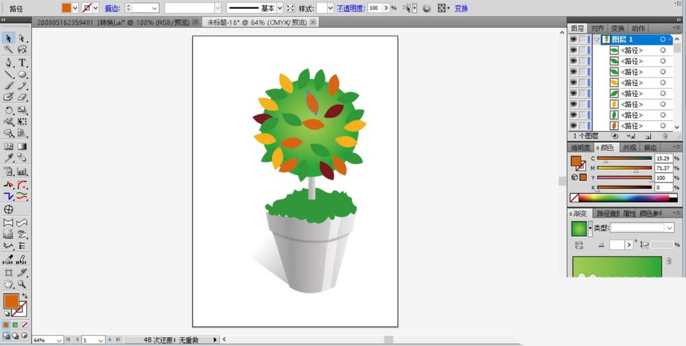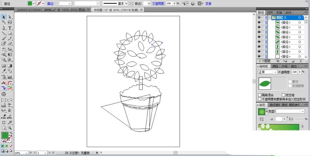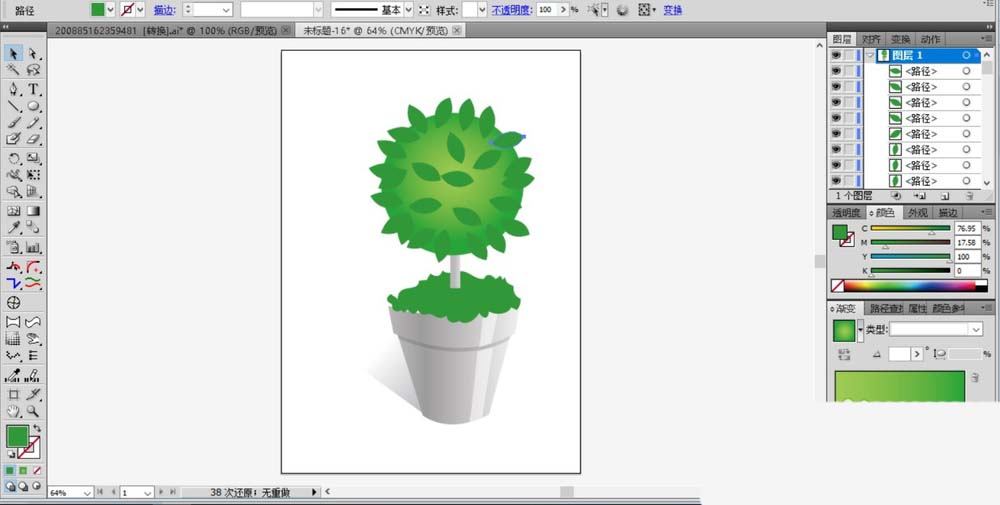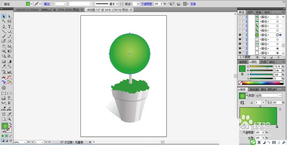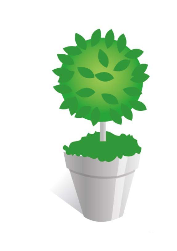 6、设置绿色的渐变填充整个3D盆栽的圆球路径,用绿色填充叶片路径,完成3D盆栽图片设计。