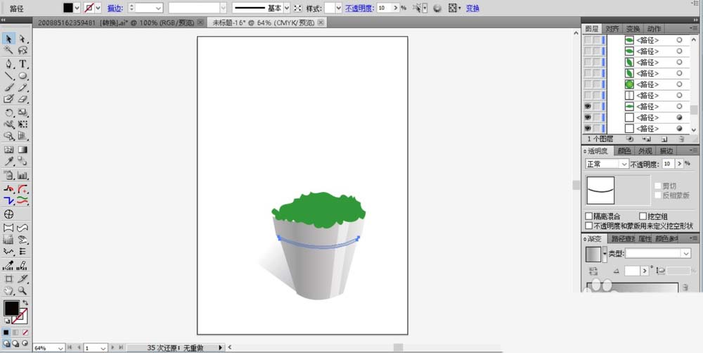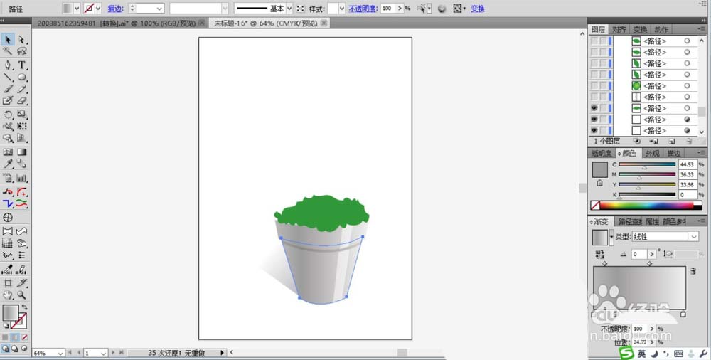4、用灰白色的渐变填充花盆的路径,用半透明的白色与黑色填充花盆的高光与暗光路径,用绿色填充花盆中的植被。