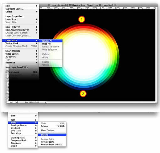 选择最外圈圆的层,打开 图层 > 图层蒙版 > 显示全部,这样就给它添加了一个蒙版(其实你也可以用图层面板下面的蒙版小按钮来添加)。接着选择画笔工具(B),选中一个具有规则形态的柔软笔刷,大小可根据你的需要来选择,硬度设为0%,然后用黑色在蒙版中涂抹示意图中的1号和2号区域。(笔刷的不透明度你也可根据实际需求来调整)